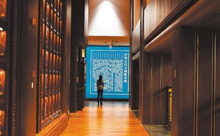 ▼中国国家版本馆中央总馆文瀚阁内陈列着珍贵的古籍出版物,集中展示《永乐大典》《古今图书集成》等原大仿真影印本、精选古籍影印本和原雕版刷印本。