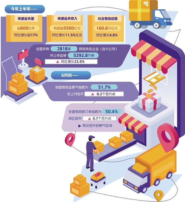 数据显示,上半年,全国社会物流总额160.6万亿元,按可比价格计算,同比增长4.8%,比1月份至5月份提高0.3个百分点,二季度环比提高1.6个百分点,年内物流需求累计增长整体呈回升态势。6月份,中国物流业景气指数为51.7%,较上月回升0.2个百分点,中国快递发展指数为366.3,同比提升26.6%。