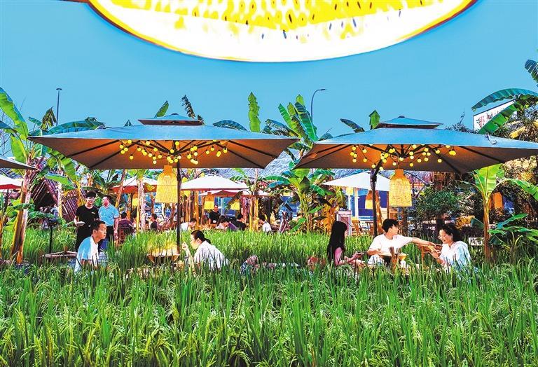 近日,游客和市民在重庆市北碚区朝阳街道“稻田餐厅”一边享受美食,一边体验乡村气息。商家将水稻栽种在餐厅外,吸引众多游客和市民前来打卡消费。连日来,当地举办城市露营节、周末集市等活动,推动“夜经济”升温,释放消费新活力。秦廷富摄(中经视觉)
