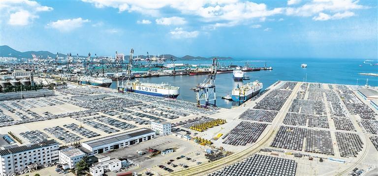 8月2日,运载商品车的滚装船靠泊山东港口烟台港汽车码头。数据显示,上半年,全国港口完成货物吞吐量81.9亿吨,同比增长8.0%。其中,6月份,全国港口完成货物吞吐量144297万吨,同比增长8.5%。