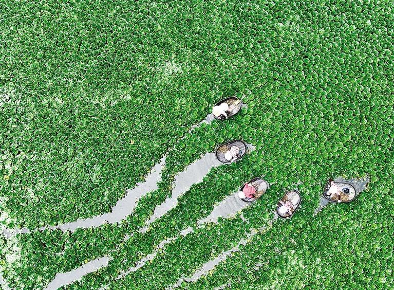 8月1日,浙江省湖州市德清县下渚湖街道四都村村民划着菱桶采摘菱角。连日来,当地种植的菱角陆续进入成熟期,村民们忙着采摘以供应市场。近年来,德清县以水环境治理形成的优质水域生态为依托,利用水塘、洼地种植菱角等水生经济作物,发展“水上经济”特色产业,助力农民增收致富。 谢尚国摄(中经视觉)