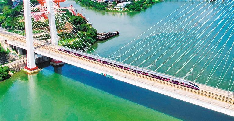 8月4日,浙江省杭州市复兴号亚运智能动车组列车驶过合杭高铁湖杭段富春江特大桥。当日是杭州第19届亚运会倒计时50天,专为杭州亚运会打造的复兴号亚运智能动车组列车迎来首次载客运行。周 围摄(中经视觉)