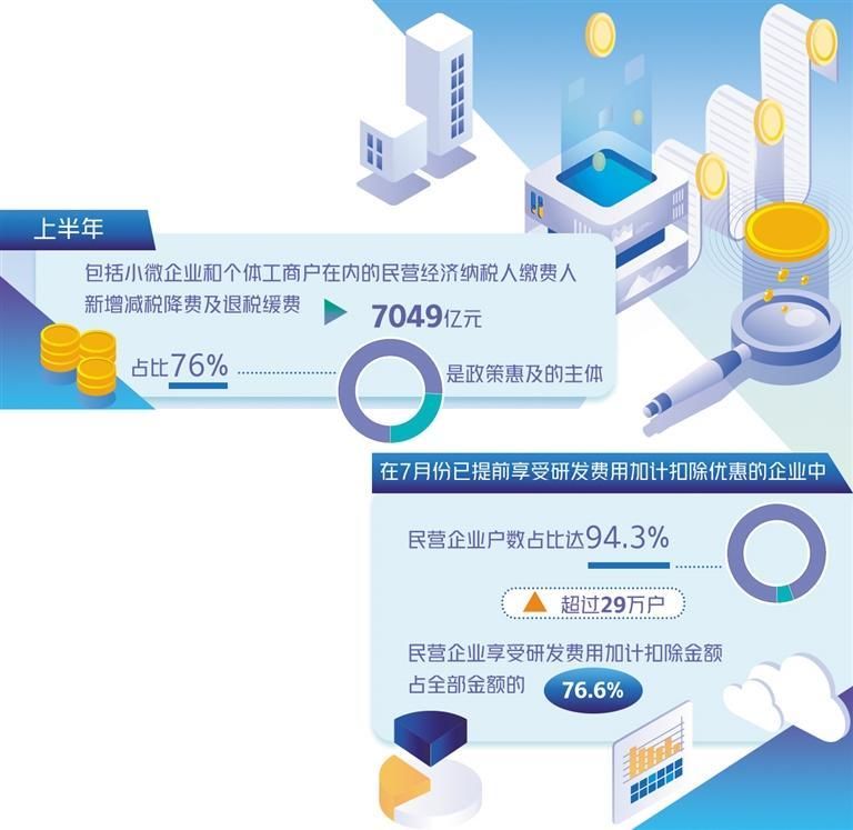 记者从国家税务总局获悉,上半年,税务部门不折不扣落实惠及民营企业发展的各项税费支持政策,包括小微企业和个体工商户在内的民营经济纳税人缴费人新增减税降费及退税缓费7049亿元,占比76%,是政策惠及的主体。