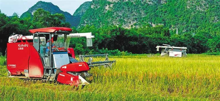 8月9日,广西柳州市融水苗族自治县融水镇,当地农民抓紧农时抢收,确保稻谷颗粒归仓。近年来,当地大力推广优质杂交水稻产业化种植,全力保障粮食安全,促进农业丰收、农民增收,助力乡村振兴。