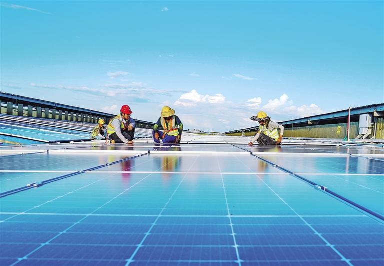 8月10日,中铁十五局集团电气化公司江西新钢联天公司厂房屋顶分布式光伏发电项目施工现场,施工人员正在安装光伏板。近年来,江西省聚焦“双碳”目标,推动能源低碳转型。今年上半年,江西新能源装机新增346万千瓦。徐 云摄(中经视觉)