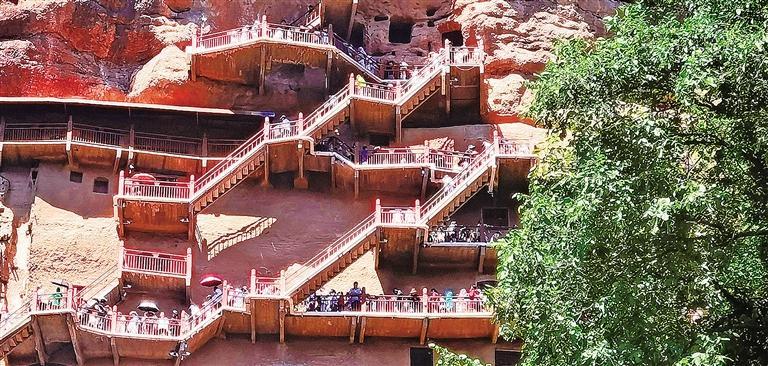 8月12日,游客在世界文化遗产甘肃省天水市麦积山石窟游览。今年前7月,麦积山大景区共接待国内外游客137.61万人(次),较疫情前的2019年同期增长20%以上,旅游产业呈现强劲增长态势。赵建伟摄(中经视觉)