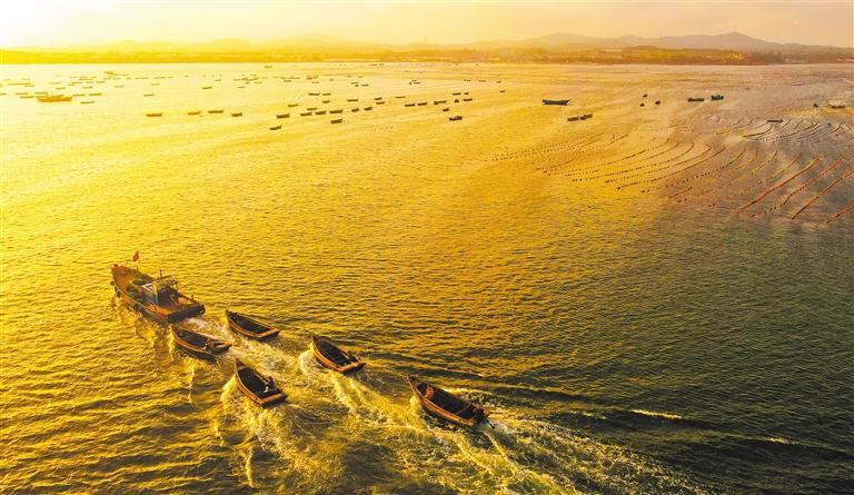山东省荣成市爱伦湾海洋牧场,养殖工人驾驶渔船返回码头(无人机照片)。山东荣成拥有50余万亩可养殖海域和300多种海洋经济物种,当地积极推广浅海多营养层级生态养殖,形成海洋碳汇。杨志礼摄(中经视觉)