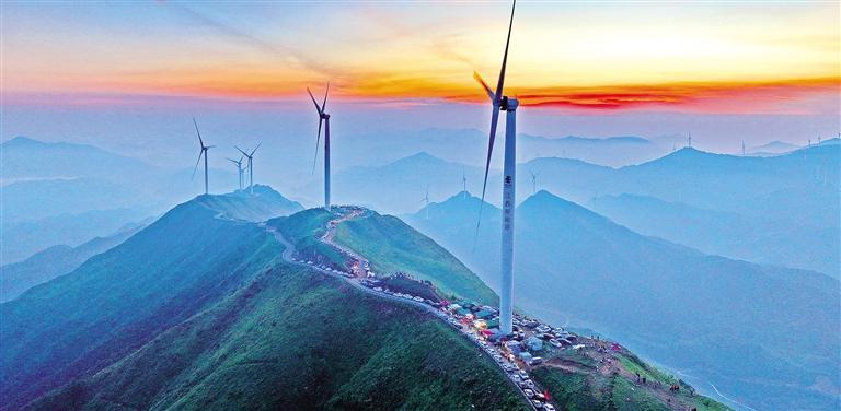 近日,江西赣州市上犹县双溪乡,一座座风力发电机矗立在山巅,与朝霞薄雾、绿树山石交相辉映,构成一幅壮美的生态画卷。近年来,赣州市牢固树立绿水青山就是金山银山的理念,大力发展风力发电等绿色产业,改善电力供需结构,减少碳排放,为实现经济社会高质量发展增添动能。