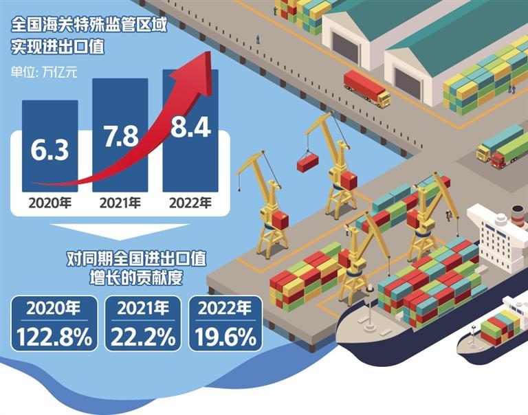 以综保区为代表的海关特殊监管区域历经30余年,逐渐发展成引领开放型经济建设的重要平台。2020年至2022年,全国海关特殊监管区域分别实现进出口值6.3万亿元、7.8万亿元、8.4万亿元,3年跨越3个万亿元台阶,对同期全国进出口值增长的贡献度分别为122.8%、22.2%和19.6%。今年前7个月,全国特殊区域进出口值4.48万亿元,同比增长0.8%,较同期全国外贸增速高0.4个百分点。