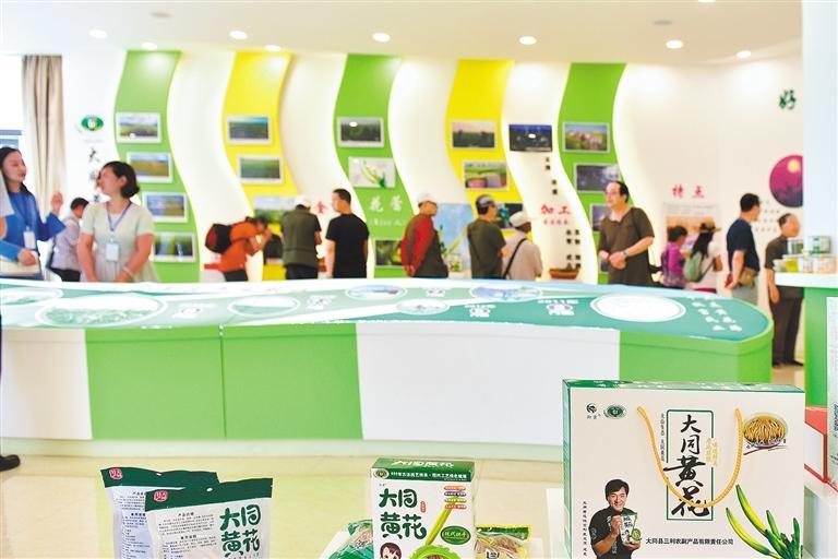 ▶大同市云州区坊城新村黄花产业园,琳琅满目的黄花产品吸引客户购买订货。目前,大同市已开发菜品、食品、饮品、功能食品、化妆品、文创产品等六大系列130余种黄花产品。