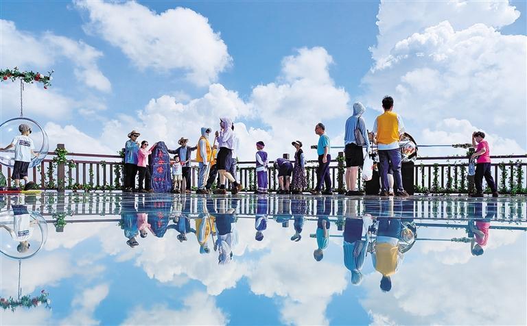 8月20日,游客在江苏省连云港市花果山景区“天空之镜”景点游览。当前,暑期游已经进入后期,但连云港市旅游市场热度不减,各大景区接待游客量持续走高。王健民摄(中经视觉)