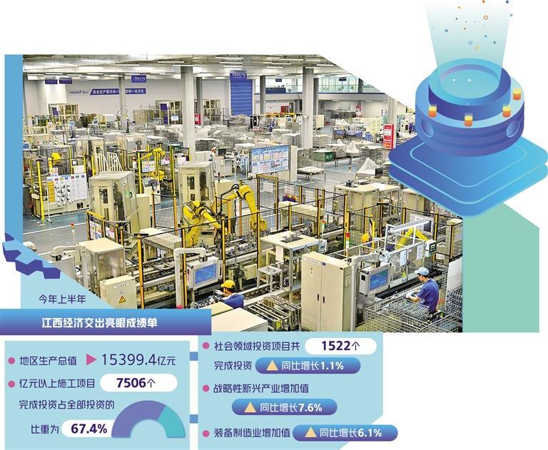 今年以来,江西省深入抓好稳经济一揽子政策措施落地见效,全省高质量发展稳步推进,呈现出工业生产稳步回升、发展新动能不断壮大、基础设施投资持续增长、消费进一步提质扩容等突出特点,上半年实现地区生产总值15399.4亿元,交出了一份殊为不易的“年中答卷”。