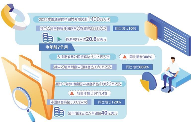 旅游业也是柬埔寨疫后复苏最快的行业之一。自2021年发布《旅游业疫后复苏路线图》以来,柬埔寨旅游业实现了稳步快速复苏。2022年柬埔寨接待国内外旅客近1400万人次,其中入境柬埔寨的外国旅客人数超过227万人次,同比增长了10倍,旅游总收入达20.6亿美元。据柬埔寨旅游部最新统计,今年前7个月,入境柬埔寨的外国旅客达303万人次,较去年同期增长308%。其中入境柬埔寨的中国旅客达31.8万人次,同比增长669%。预计今年柬埔寨国内游客将达1600万人次,较去年增长约11.4%。来柬埔寨考察和旅游的外国旅客将达500万人次,同比增长120%。全年旅游总收入有望达到40亿美元。