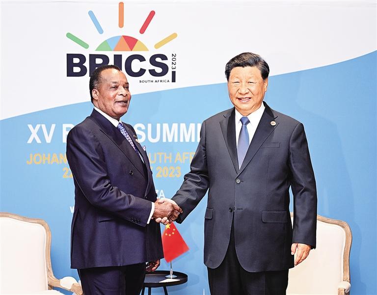 本报约翰内斯堡8月24日讯(记者田士达)当地时间8月24日上午,国家主席习近平在约翰内斯堡出席金砖国家领导人会晤期间会见刚果(布)总统萨苏。