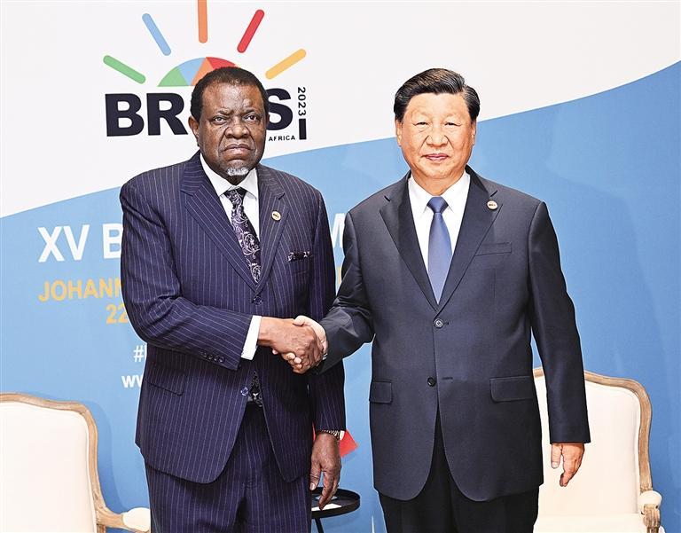 本报约翰内斯堡8月24日讯(记者田士达)当地时间8月24日上午,国家主席习近平在约翰内斯堡出席金砖国家领导人会晤期间会见纳米比亚总统根哥布。