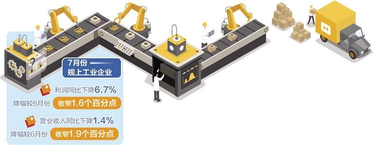 国家统计局数据显示,7月份,工业生产稳定恢复,产销衔接水平明显提升,企业营收边际改善,盈利水平持续好转。前7月,全国规模以上工业企业利润同比下降15.5%,降幅较前6月收窄1.3个百分点,累计利润降幅自年初以来逐月收窄,呈现稳步回升态势。7月份规上工业企业利润同比下降6.7%,降幅较6月份收窄1.6个百分点。