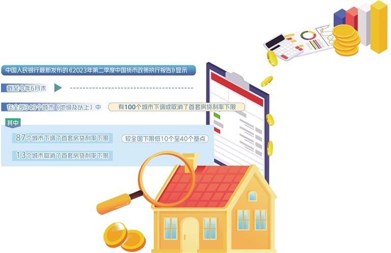 另一方面,“首套住房贷款利率政策动态调整机制”继续得到落实。2022年12月,“首套住房贷款利率政策动态调整机制”建立。中国人民银行最新发布的《2023年第二季度中国货币政策执行报告》显示,截至今年6月末,在全部343个城市(地级及以上)中,有100个城市下调或取消了首套房贷利率下限。其中,87个城市下调了首套房贷利率下限,较全国下限低10个至40个基点,13个城市取消了首套房贷利率下限。