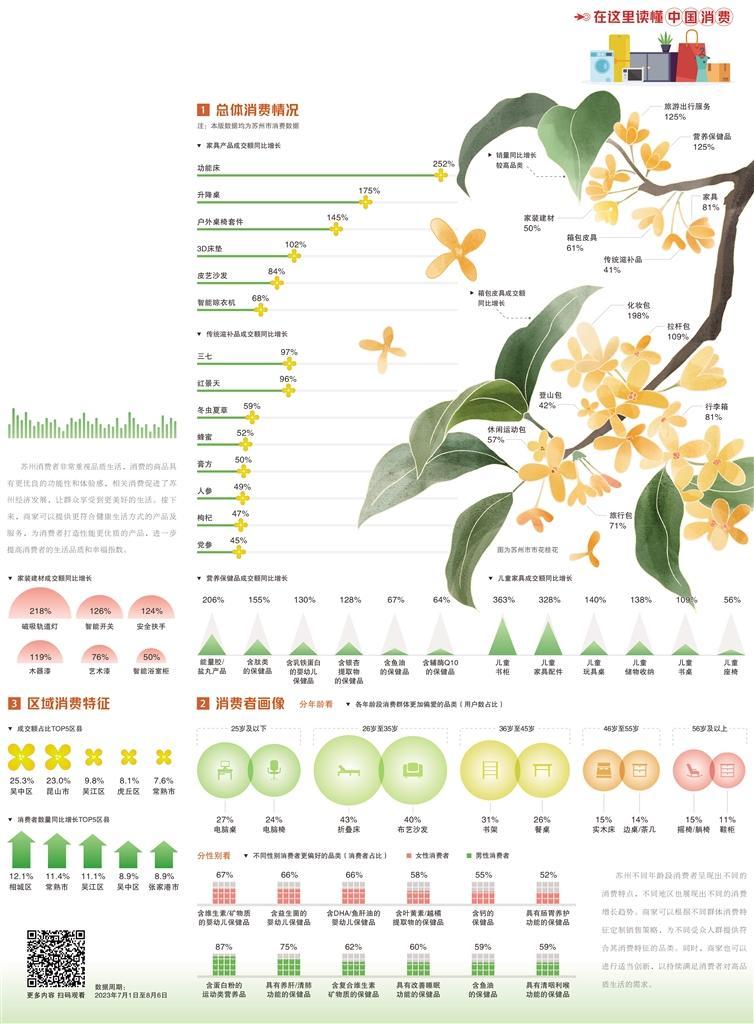 从消费品类看,苏州消费者对高性能、智能化的产品需求持续增长。在家具消费上,消费者更注重家具的功能性、舒适性与体验感;在家装建材消费上,智能家装成为众多消费者的首选。此外,苏州消费者愿意为家庭生活注入更多快乐和健康元素,旅行相关产品消费显著增长,保健滋补类产品也出现消费高峰。