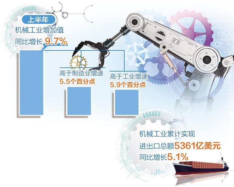 今年以来,机械工业经济运行稳中有进。一季度实现平稳开局,二季度保持上升态势,上半年机械工业增加值同比增长9.7%,分别高于同期全国工业和制造业增速5.9个和5.5个百分点。