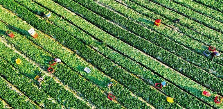 8月26日,甘肃省张掖市甘州区乌江镇元丰村供粤港澳大湾区蔬菜基地,菜农们正在元丰村供粤港澳大湾区蔬菜基地采摘蔬菜。近年来,乌江镇充分发挥区域资源优势和特色产业优势,引进多家蔬菜生产公司,建成10万亩优质蔬菜基地,带动了农民增收。