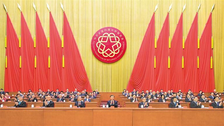 人民大会堂大礼堂气氛庄重而热烈。主席台上方悬挂着“第十一次全国归侨侨眷代表大会”的会标,后幕正中是象征着五大洲侨胞心向祖国的中国侨联会徽,10面红旗分列两侧。二楼眺台悬挂着“以习近平新时代中国特色社会主义思想为指导,全面贯彻党的二十大精神,团结凝聚广大归侨侨眷和海外侨胞为全面建设社会主义现代化国家、全面推进中华民族伟大复兴而奋斗!”巨型横幅。来自全国各地的近1200名归侨侨眷代表和来自100多个国家的近600名海外侨胞特邀嘉宾欢聚一堂。