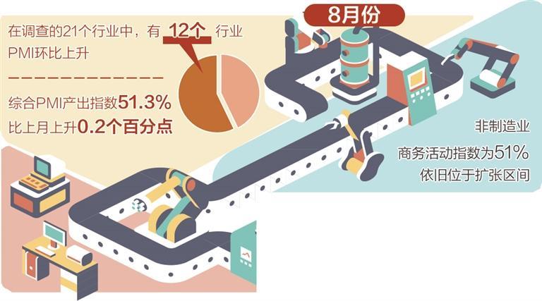 8月份,非制造业商务活动指数为51%,比上月下降0.5个百分点,保持扩张态势。数据显示,建筑业有所升温,服务消费继续活跃,社会融资活动有所回升。