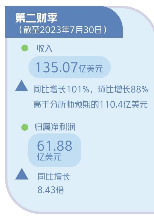 具体来看,英伟达第二财季收入135.07亿美元,同比增长101%,环比增长88%,高于分析师预期的110.4亿美元;归属净利润实现61.88亿美元,同比增长8.43倍。同时,英伟达还给出了一份远超市场预期的营收展望,预计第三财季营收为160亿美元,比分析师平均预期的123亿美元高出37亿美元。