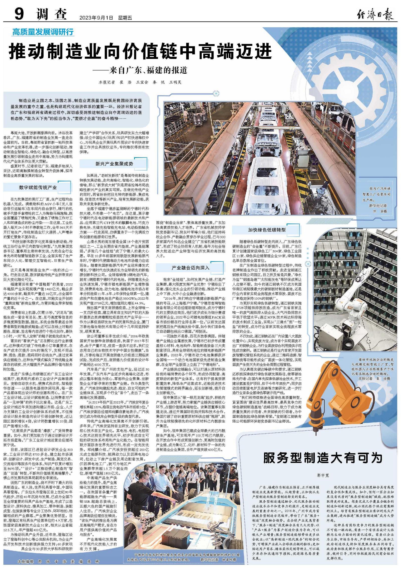 制造业是立国之本、强国之基,制造业高质量发展既是我国经济高质量发展的重中之重,也是构建现代化经济体系的重要一环。经济日报记者在广东和福建两省调查过程中,深切感受到推进制造业向中高端迈进的蓬勃态势,“敢为天下先”的担当作为,“爱拼才会赢”的奋斗精神……