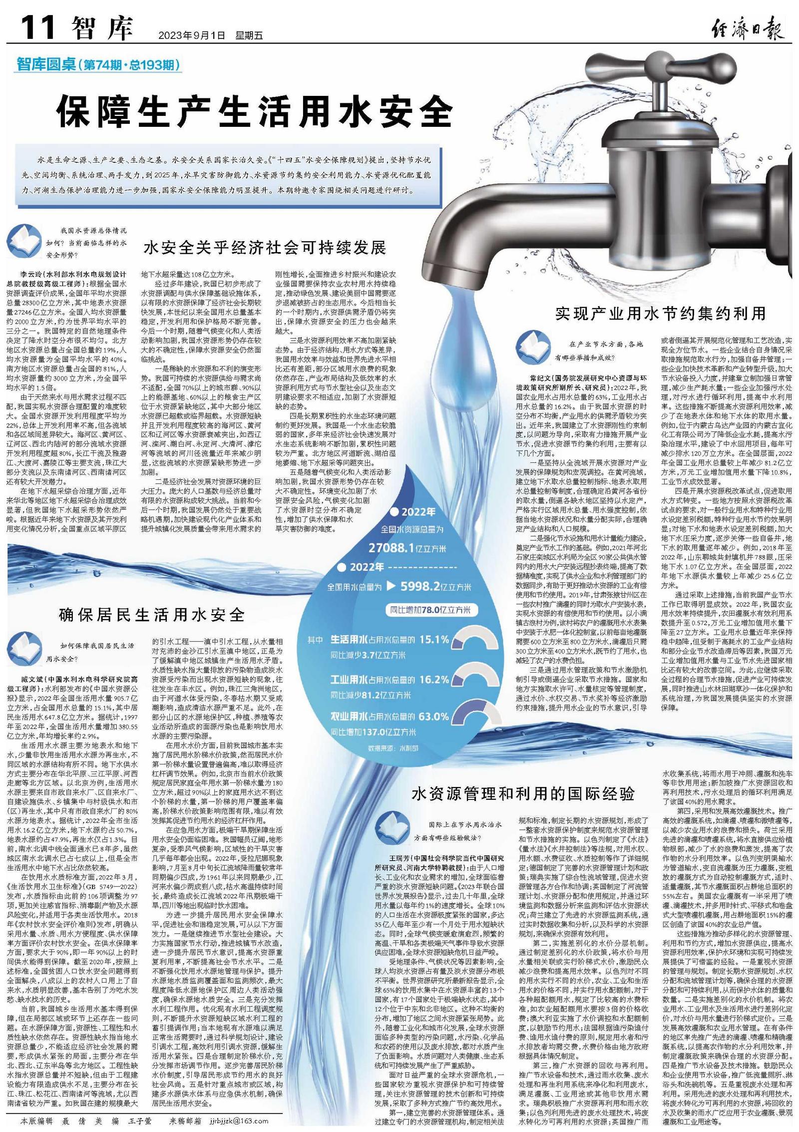 水是生命之源、生产之要、生态之基。水安全关系国家长治久安。《“十四五”水安全保障规划》提出,坚持节水优先、空间均衡、系统治理、两手发力,到2025年,水旱灾害防御能力、水资源节约集约安全利用能力、水资源优化配置能力、河湖生态保护治理能力进一步加强,国家水安全保障能力明显提升。本期特邀专家围绕相关问题进行研讨。