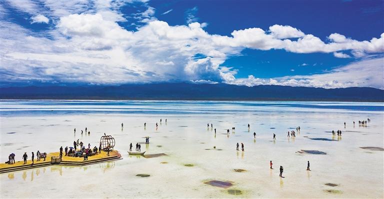 ①8月25日,位于青海省乌兰县茶卡镇的茶卡盐湖展现水映天、天接地,人在湖中走,宛如画中游的独特美景。