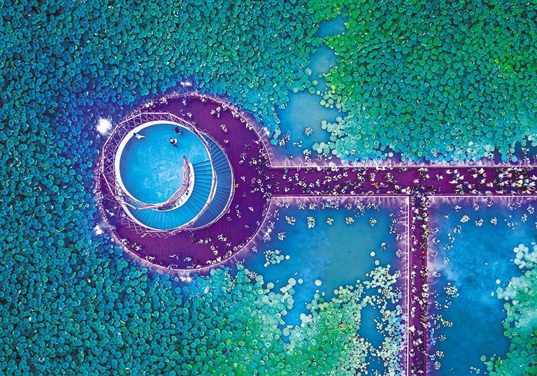 ⑦8月16日,安徽省池州市贵池区,平天湖生态湿地灯光璀璨、夜色迷人,吸引市民游客纷至沓来。