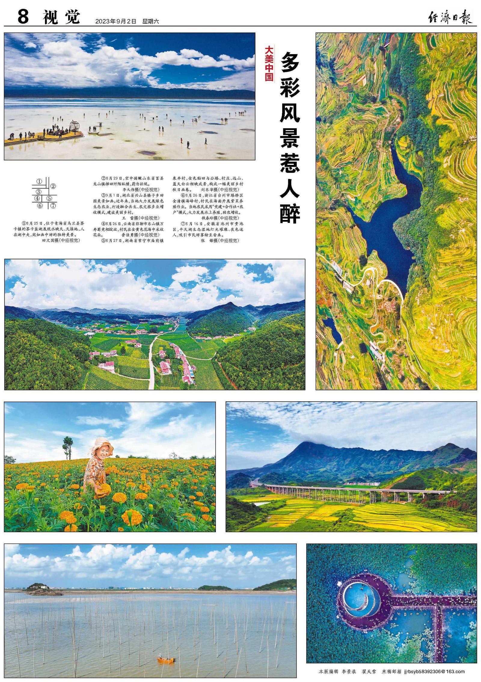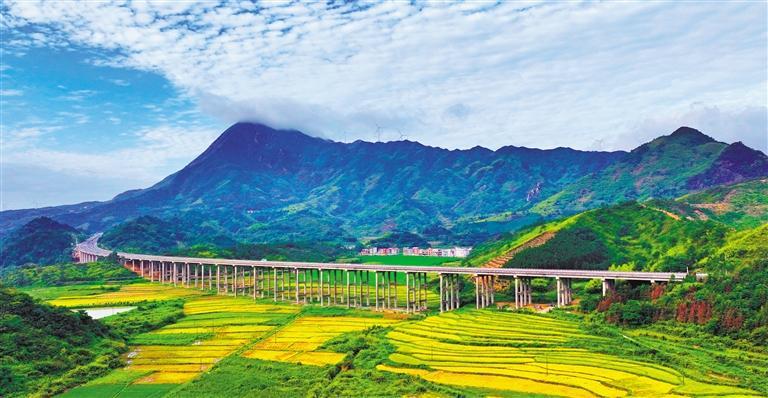 ⑤8月27日,湖南省常宁市庙前镇泉井村,金色稻田与公路、村庄、远山、蓝天白云相映成景,构成一幅美丽乡村秋日画卷。刘东华摄(中经视觉)