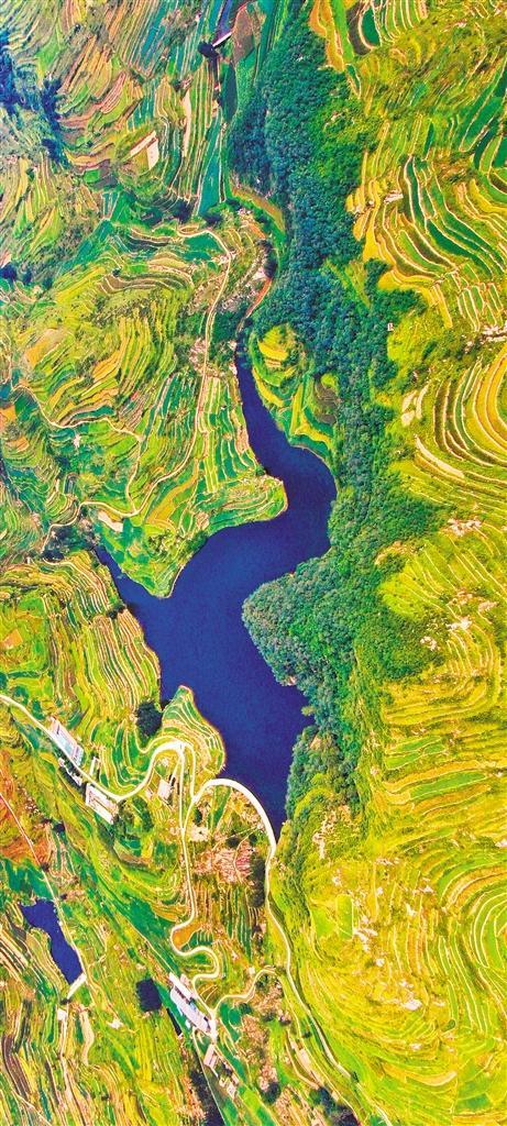 ②8月29日,空中俯瞰山东省莒县龙山镇梯田阡陌纵横,蔚为壮观。