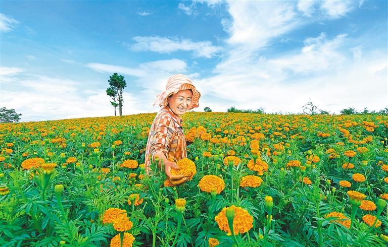 ④8月26日,云南省弥勒市东山镇万寿菊竞相绽放,村民在金黄色花海中采收花朵。普佳勇摄(中经视觉)