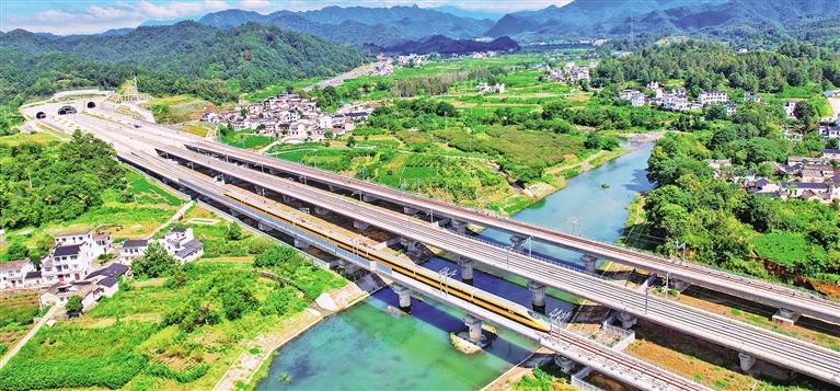 9月1日,一列综合检测列车行驶在昌景黄高铁黄山北至祁门南之间的线路上。昌景黄高铁是杭州至南昌高铁的重要组成部分,线路全长300公里,设计时速350公里,开通运营后将促进沿线经济协同发展。