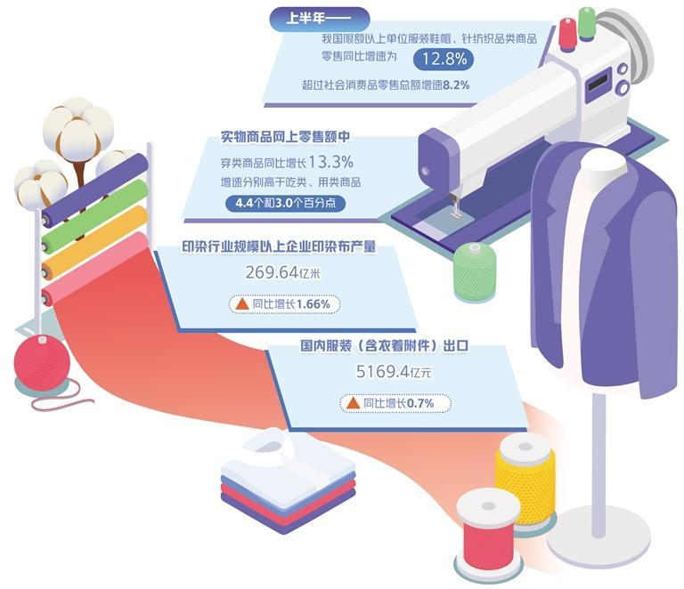 “从上半年消费情况来看,服装市场的恢复态势相对不错。”中华全国商业信息中心统计处副处长殷夏表示,在国家统计局公布的16类限额以上单位商品零售数据中,服装鞋帽、针纺织品的零售额增速达到12.8%。我国服装品牌在增品种、提品质、创品牌上做出了努力,积极吸收科技、绿色、国潮等有益元素,服装产品价值得到提升,是今年服装市场实现较快复苏的基础。
