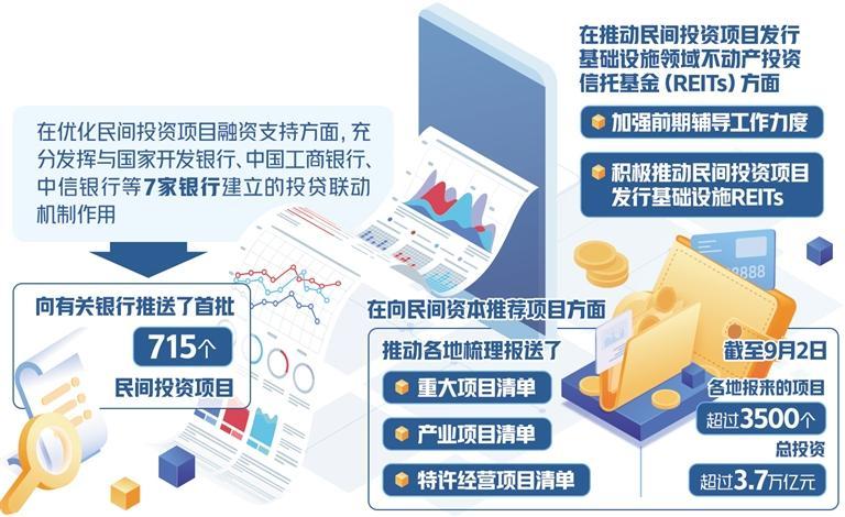 为贯彻落实《意见》,国家发展改革委印发了《关于进一步抓好抓实促进民间投资工作努力调动民间投资积极性的通知》,提出了17项有针对性的具体措施。据介绍,在优化民间投资项目融资支持方面,充分发挥与国家开发银行、中国工商银行、中信银行等7家银行建立的投贷联动机制作用,向有关银行推送了首批715个民间投资项目,请有关金融机构按照市场化、法治化原则,自主选择符合条件的项目给予金融支持。在向民间资本推荐项目方面,推动各地梳理报送了重大项目清单、产业项目清单、特许经营项目清单。截至9月2日,各地报来的项目超过3500个,总投资超过3.7万亿元。在推动民间投资项目发行基础设施领域不动产投资信托基金(REITs)方面,加强前期辅导工作力度,积极推动民间投资项目发行基础设施REITs。近日,国家发展改革委向证监会推荐了金风科技风力发电项目,这是推荐的首单民间投资清洁能源REITs项目。