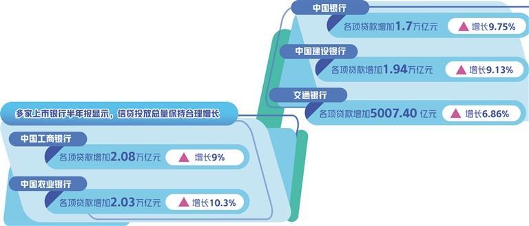 今年上半年,多家上市银行的信贷投放总量保持了合理增长。其中,中国工商银行各项贷款增加2.08万亿元,增长9%;中国农业银行增加2.03万亿元,增长10.3%;中国银行增加1.7万亿元,增长9.75%;中国建设银行增加1.94万亿元,增长9.13%;交通银行增加5007.40亿元,增长6.86%。