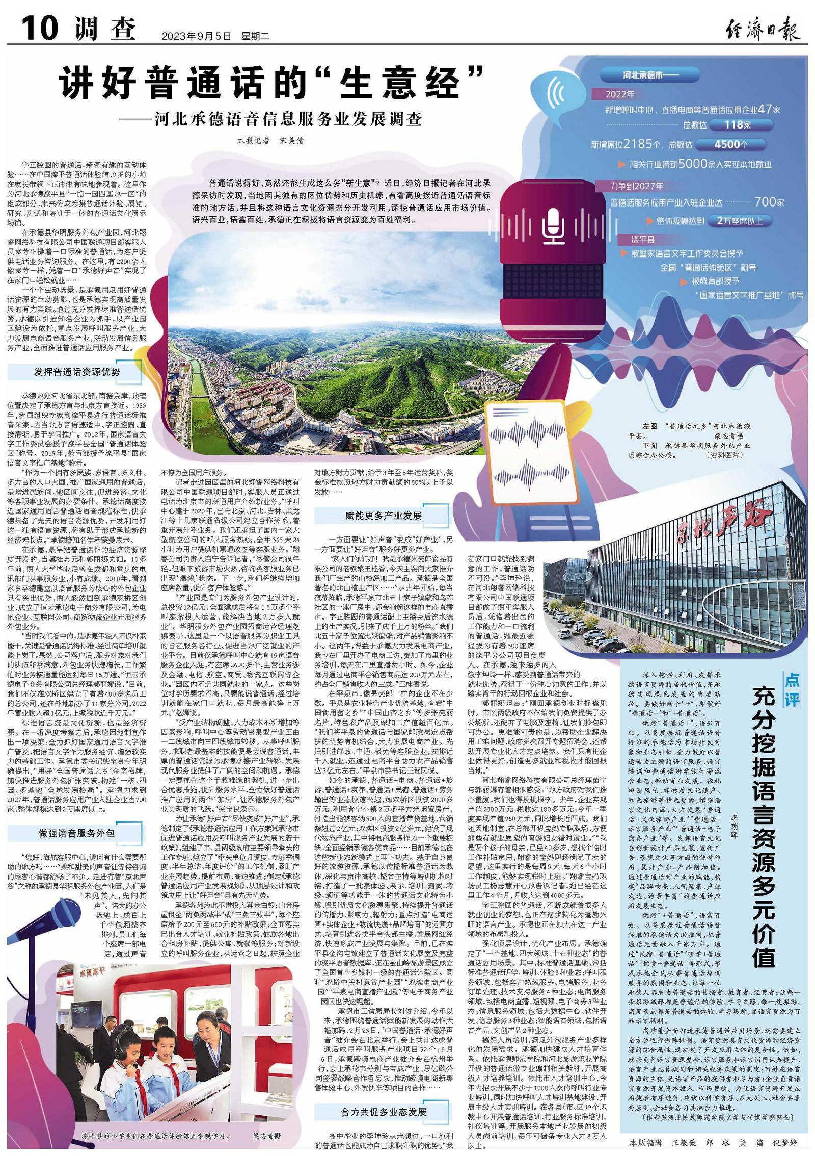 一个个生动场景,是承德用足用好普通话资源的生动剪影,也是承德实现高质量发展的有力实践。通过充分发挥标准普通话优势,承德以引进知名企业为抓手,以产业园区建设为依托,重点发展呼叫服务产业,大力发展电商语音服务产业,联动发展信息服务产业,全面推进普通话应用服务产业。