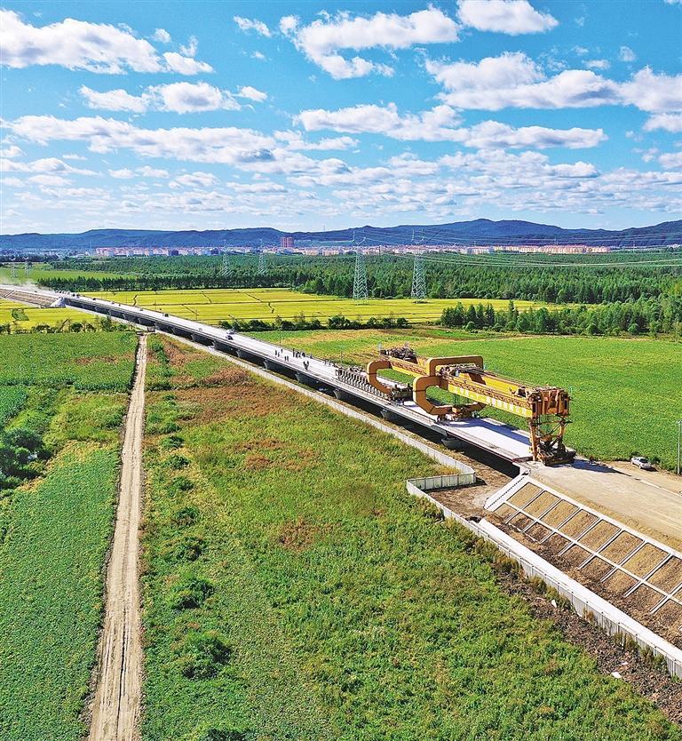 9月5日,黑龙江省伊春市哈伊高铁施工现场,中铁二十二局建设者完成先行工程最后一榀32米箱梁架设,标志着国内在建的最北高铁取得重大进展。张 龙摄(中经视觉)