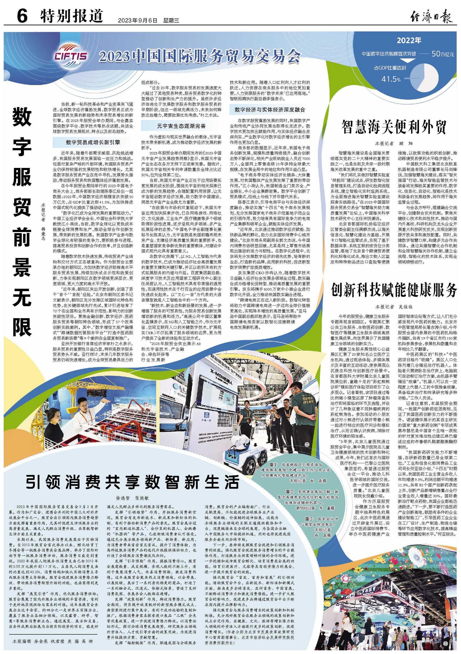当前,新一轮科技革命和产业变革突飞猛进,全球数字经济蓬勃发展,数字贸易正成为国际贸易发展的新趋势和未来贸易增长的新引擎。在2023年服贸会举办期间,与会嘉宾围绕数字平台、数字技术等热点话题,共话全球数字贸易发展现状、特点以及前沿趋势。