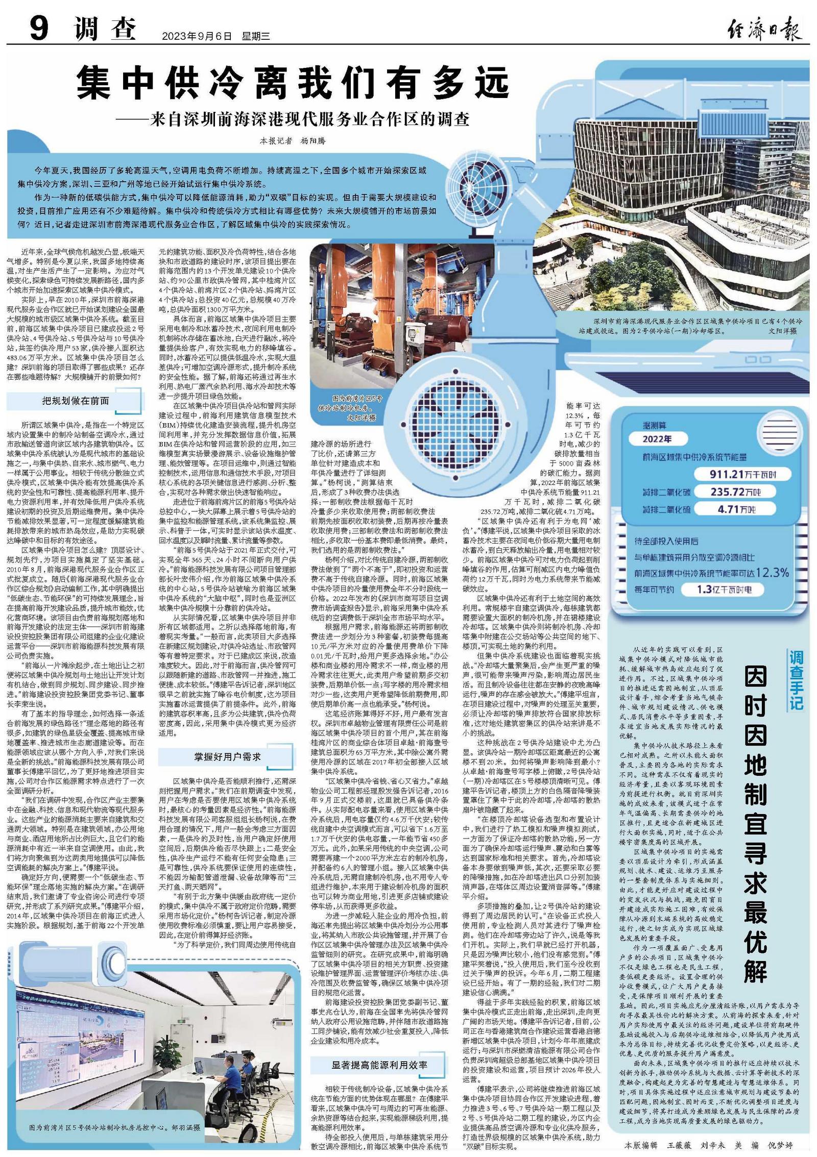 杨柯介绍,对比传统自建冷源,两部制收费法做到了“两个不高于”,即初投资和运营费不高于传统自建冷源。同时,前海区域集中供冷项目的冷量使用费全年不分时段统一价格。2022年发布的《深圳市商写项目空调费市场调查报告》显示,前海采用集中供冷系统后的空调费低于深圳全市市场平均水平。
