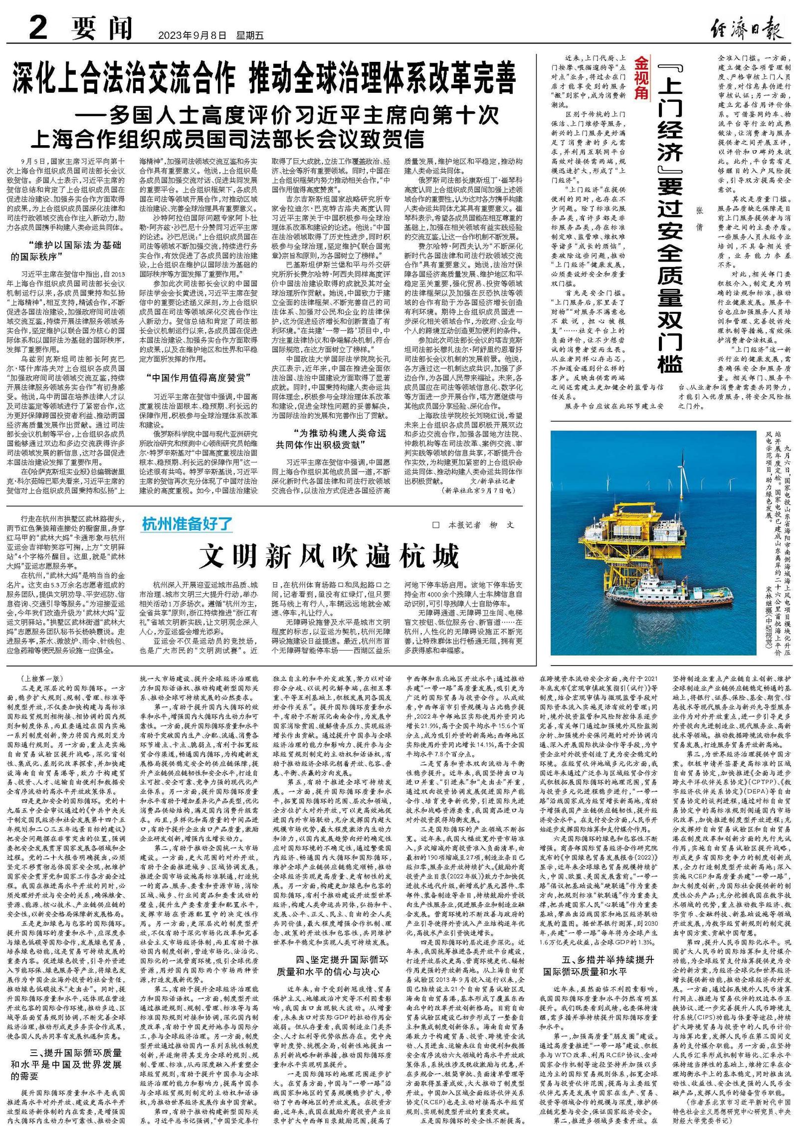 五是更加绿色与包容的国际循环。提升国际循环的质量和水平,应深度参与绿色低碳等国际合作,发展绿色贸易,培养绿色动能,这是贸易可持续发展的重要内容。促进绿色投资,引导外资进入节能环保、绿色服务等产业,将绿色发展作为中国企业海外投资的社会责任,推动绿色低碳技术“走出去”。同时,提升国际循环质量和水平,还体现在营造开放包容的国际合作环境,推动多边、区域等层面贸易规则协调,不断完善全球经济治理,推动形成更多务实合作成果,使各国人民共同享有发展机遇和实惠。