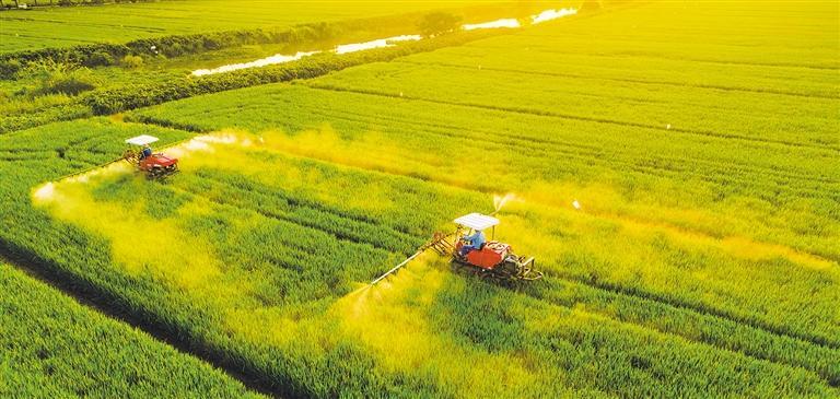 9月7日,正值水稻抽穗期,江苏省昆山市锦溪镇三联村双娄里稻田,农民抢抓农时,驾驶植保机为水稻喷施农药,对水稻进行秋季管护,为秋粮丰收打基础。