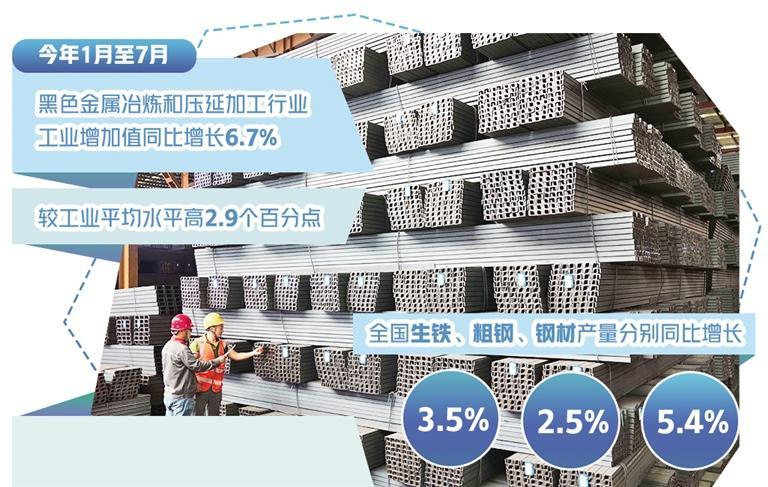 数据显示,今年1月至7月,黑色金属冶炼和压延加工行业工业增加值同比增长6.7%,较工业平均水平高2.9个百分点,全国生铁、粗钢、钢材产量分别同比增长3.5%、2.5%和5.4%。钢材消费结构也在持续优化,建筑业用钢总体占比下降,钢结构以及制造业用钢增长明显,新能源、高端装备等新兴产业带动钢材高端化发展。
