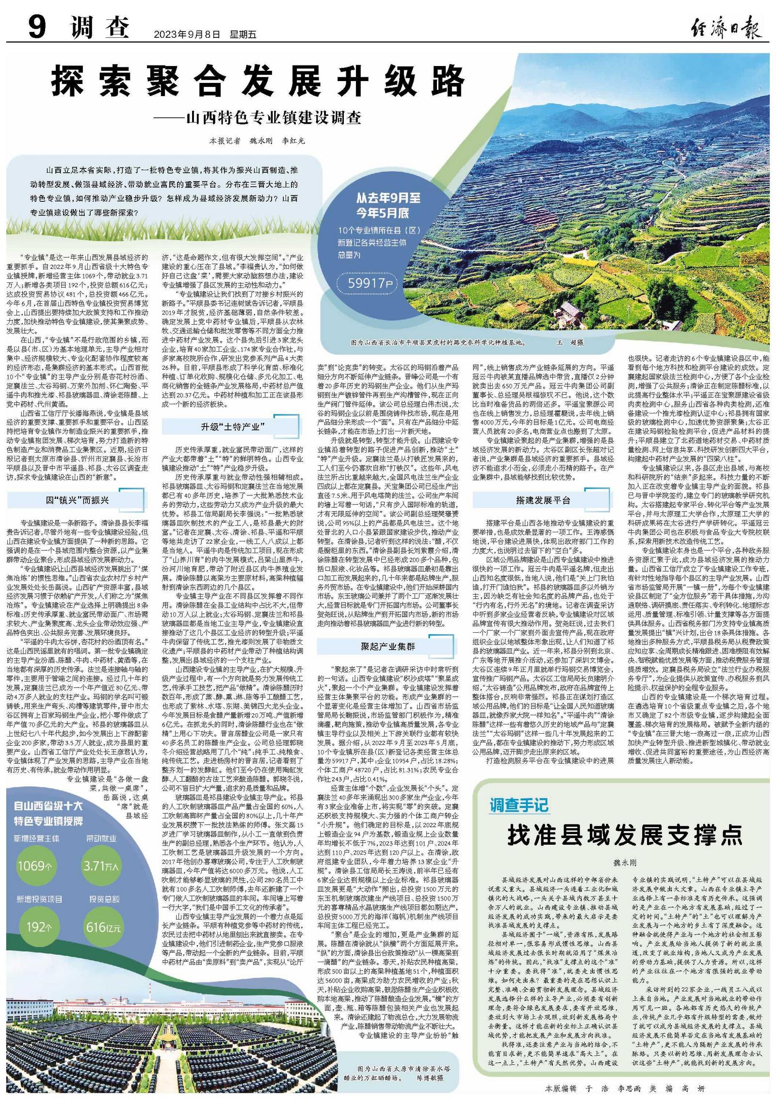 山西省工信厅厅长潘海燕说,专业镇是县域经济的重要支撑、重要抓手和重要平台。山西坚持把培育专业镇作为制造业振兴的重要抓手,推动专业镇抱团发展、梯次培育,努力打造新的特色制造产业和消费品工业集聚区。近期,经济日报记者到太原市清徐县、忻州市定襄县、长治市平顺县以及晋中市平遥县、祁县、太谷区调查走访,探求专业镇建设在山西的“新意”。