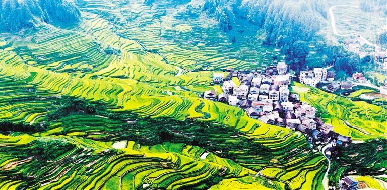 9月6日,广西柳州市融水苗族自治县杆洞乡,独具特色的苗楼与错落有致的梯田相互映衬,构成美丽的田园风景。当地7万多亩高山梯田水丰肥足,水稻长势喜人,丰收在望。龙 涛摄(中经视觉)
