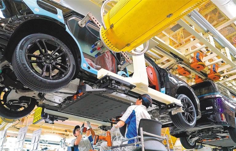 ▶“造车新实力”岚图汽车工作人员在进行装配作业。岚图汽车整合全球先进制造技术和理念,全面应用5G先进技术打造现代化“智造”工厂,总装车间是数字化运营的前沿阵地。