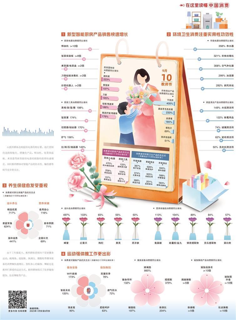 教师群体尤其重视环境卫生消费,并且十分注重产品的实用性和功效性。数据显示,净水器、衣物消毒机、空气净化器等环境电器,水垢清洁剂、除霉用品、玻璃清洁剂等家清产品,以及干洗剂、真丝羊毛洗衣液、去渍笔等衣物清洁产品的销售额均增长明显。