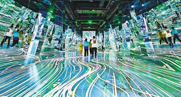 ◀8月26日,游客在山东青州古城景区“时空隧道”馆拍照留念。青州古城“时空隧道”馆通过数字交互多媒体手段,再现青州丰厚的自然、人文和历史,吸引了众多游客前来打卡。